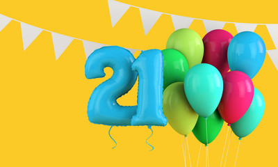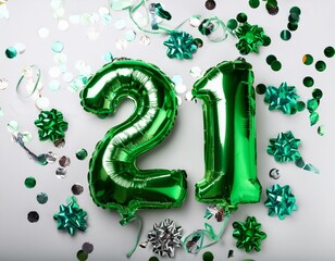 Green balloon number 21 for twenty-first birthday or anniversary party. White background with confetti