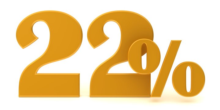 22 % percent sign percentage interest rate  golden 3d render sale symbol icon graphic isolated on white background