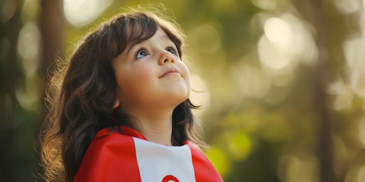 Smiling little girl in red and white during National Sovereignty and Children’s Day celebration in Turkey. Joyful preschool child with balloons and patriotic decor on April 23.