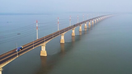 Sirajganj, Bangladesh - 23 August 2025: Aerial view of the Bangabandhu Bridge stretching across the water, with vehicles crossing the long bridge.