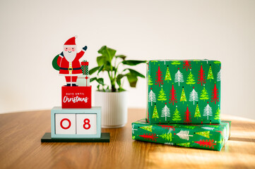 Wrapped gifts and a Santa countdown calendar show eight days till Christmas