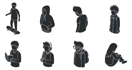 Group of eight happy cartoon children. Teenagers.