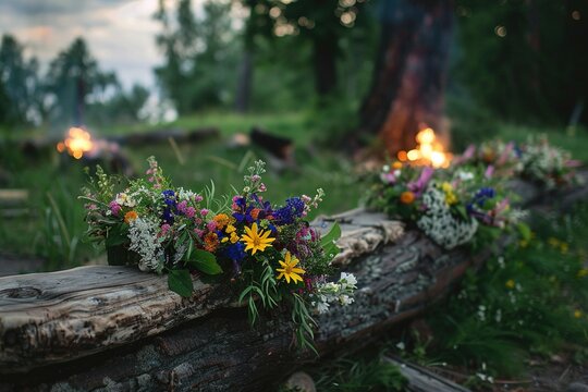Midsummer night celebration. Wooden log with flower crown and fire in lush green rural landscape.. Generative AI