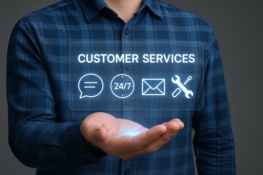 Cupped hands hold a glowing sphere marked “24/7,” surrounded by digital service icons.