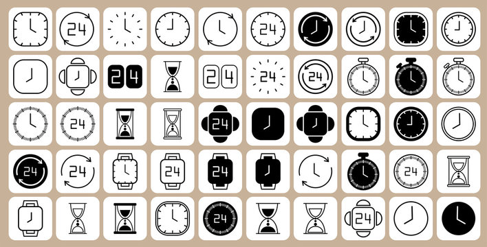 Clock line icons isolated on beige background. Black and white simple watches pack. Time concept. Vector illustration