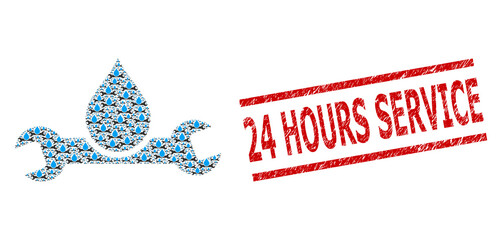 Recursive composition plumbing and 24 Hours Service grunge stamp seal. Vector collage is done of random plumbing elements. Stamp seal includes 24 Hours Service title between parallel lines.