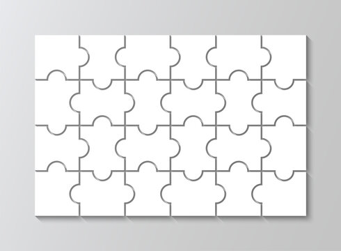 Puzzle grid template with 4x6 details. Puzzle pieces. Jigsaw layout. Laser cut frame. Vector illustration. Thinking mosaic game with 24 separate shapes on background. Paper leisure toy.