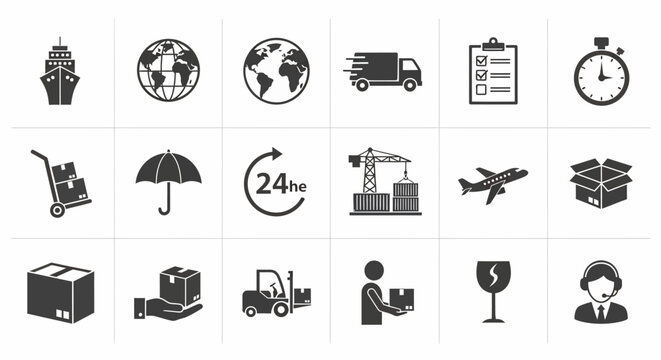 Collection of Black and White Shipping and Delivery Icons