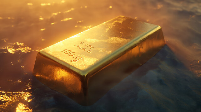 A single gold bar stamped with weight and purity, shines with a heavy glow on a textured surface reflecting light