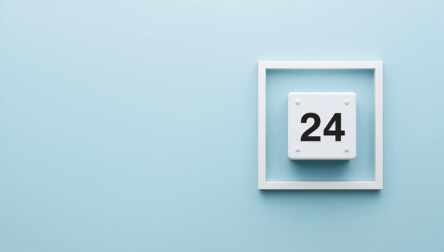 February 24th, 24th day marked on a cube calendar with a blank frame set against a pale blue backdrop. Space available for your message. Concept of a winter day in the calendar year.