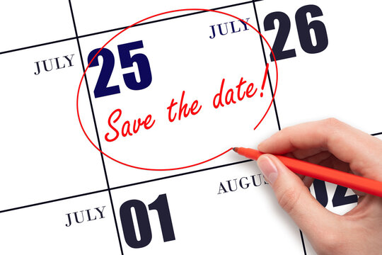 Hand drawing red line and writing the text Save the date on calendar date July 25.