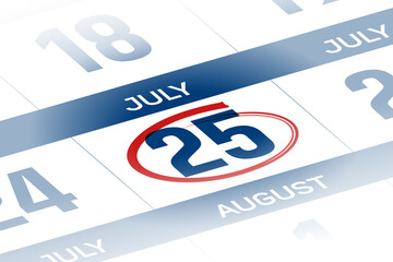 Calendar with the date July 25 and a place for designers. Illustration for an event of a certain date.