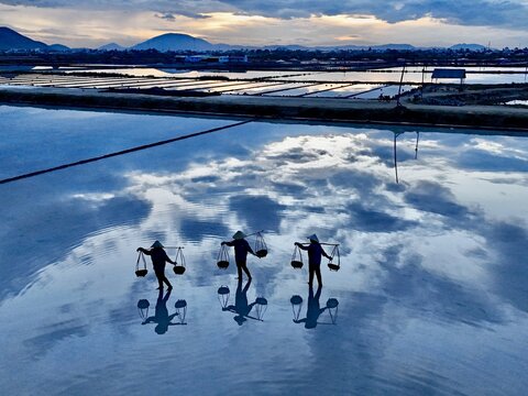Ninh Hoa, Vietnam - 25 June 2025: Aerial view of workers harvesting salt on reflective salt ponds, their silhouettes mirrored in the tranquil water, against a backdrop of distant mountains.