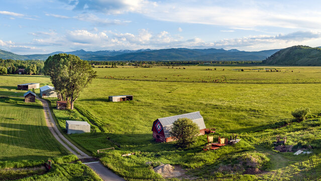 Aerial view of landscape in Jackson Hole, Wyoming, USA. June 25, 2023