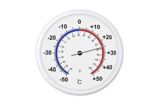 Celsius and fahrenheit scales thermometer for measuring weather temperature.  Thermometer isolated on white background. Ambient temperature minus 25 degrees celsius