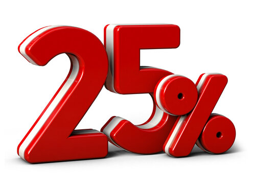25 percent in red.  Isolated on white background. Special offer twenty-five percent off discount tag. 3d render. 25%