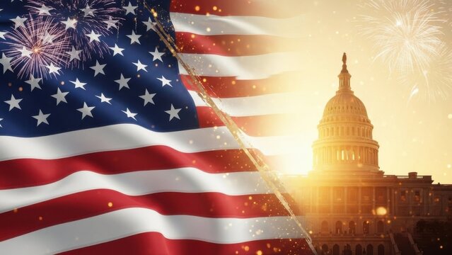 American flag and US Capitol building with fireworks for 250 years anniversary. Patriotic USA semiquincentennial 2026 celebration background for independence day and government events.