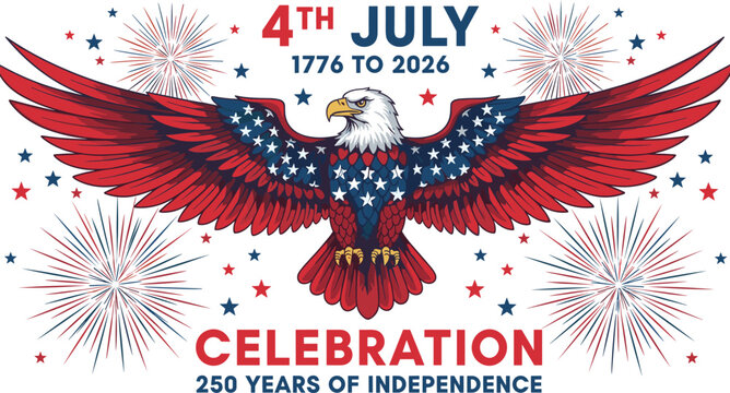 4th of July American independence celebration illustration with patriotic bald eagle, fireworks, stars, red white blue colors, 250 years freedom design