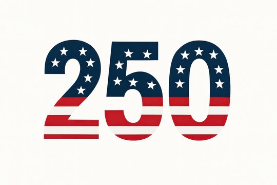 3D number 250 with American flag texture. Isolated on white for the USA Semiquincentennial 250th anniversary celebration