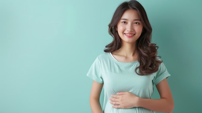 A middleaged pregnant Asian woman standing with on  253 woman, beauty, smiling, smile, person, people, model, face, studio, brunette, casual, lady, one, fashion, teen, teenager, happiness, business, c