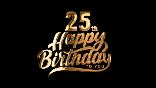 25th Happy Birthday Typography Golden text animation appear on black background. Greeting card, birthday card, invitation card, Celebration, party, holiday, wish festive decoration concept