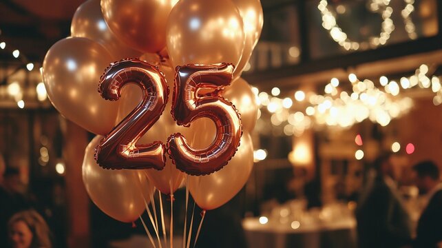 An elegant 25th birthday celebration featuring a bunch of sparkling balloons with bokeh lights in the background, creating a festive and luxurious atmosphere.