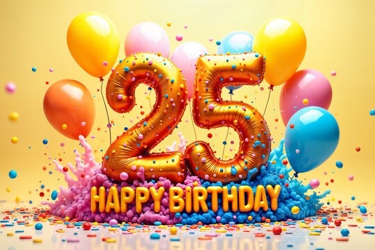 25th birthday card. Vibrant and colorful celebration of a 25th birthday, with the number twenty-five prominently displayed in gold foil balloons against a yellow background.