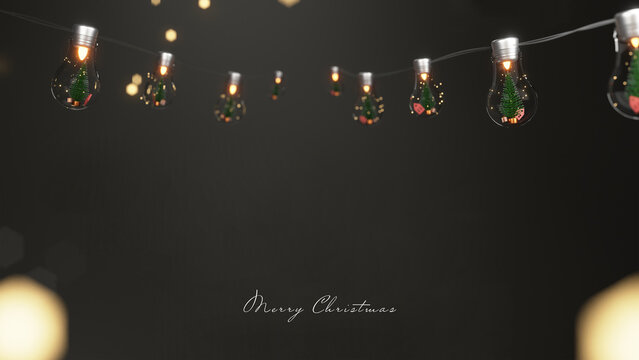 Merry Christmas Celebration Banner Design Decorated With Lighting Garland, Xmas Tree On Black Bokeh Effect Background.