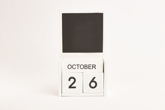 Minimalist desk calendar displaying October 26 alongside a soft white pumpkin for autumn-inspired decor. Halloween. National Pumpkin Day