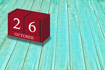 October 26th, Day 26 of October month, Red calendar on workplace green wood, Empty space for text, Copy space right, 3D illustration