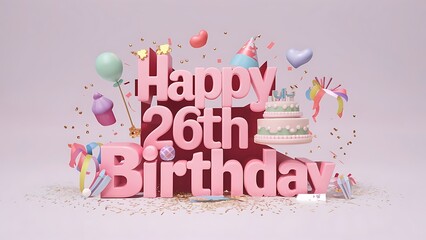 Minimalist 3D Happy 26th Birthday Background With Balloons , Hearts, Confetti And Candles, Happy Birthday Background