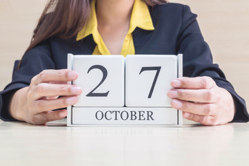 Closeup white wooden calendar with black 27 october word in blurred working woman hand on wood desk in office room , selective focus at the calendar