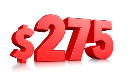 275$ Two hundred seventy five price symbol. red text number 3d render with dollar sign on white background