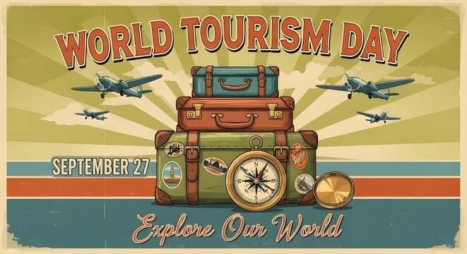 Vintage World Tourism Day poster with suitcases and the message "Explore Our World"