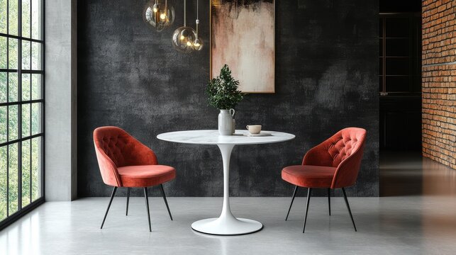 35 x 28 inch white oval dining table with two round pink velvet chairs, an accent chair, round metal legs, and a high back, suitable for home and kitchen interior design.