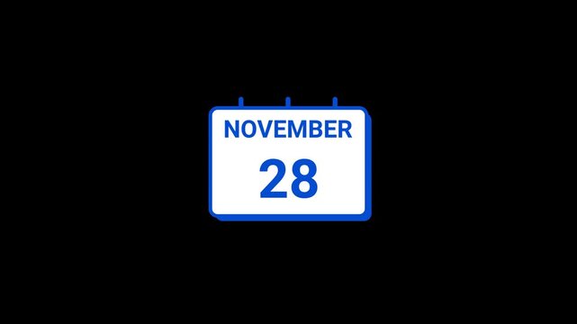 November 28 date 2025 animation . calendar animation on a black background. and stunning 4k animation.