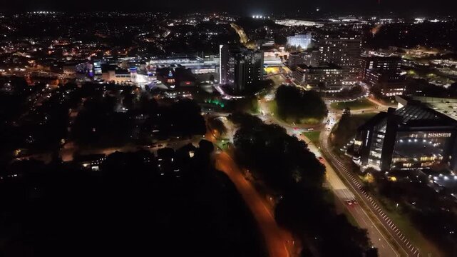 Basingstoke, UK. 28th October 2025. An aerial night capture of Basingstoke Town centre with Festival Place shopping centre, retail facilities , commercial and residential buildings.