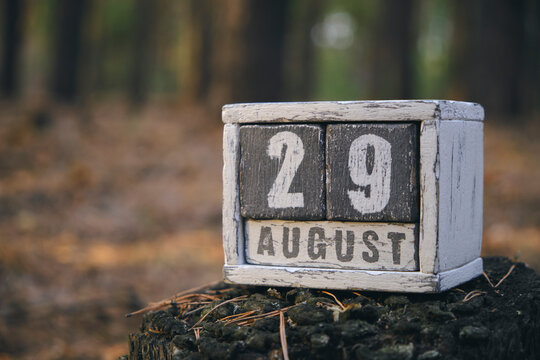 August 29 summer month, wooden calendar with date and month in forest.Day Action against Nuclear Tests.
