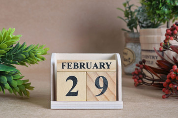 Day 29 of february month, Wooden calendar with date. Empty space for text.