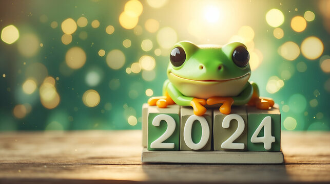 Leap day, one extra day, Leap year 29 February 2024 greeting card. Cute Green Frog Posing with 2024 Numbers on bokeh background.