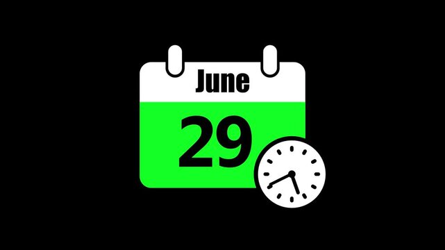 29 june month calendar with time symbol. Simple calendar icon animation and date change of time month.