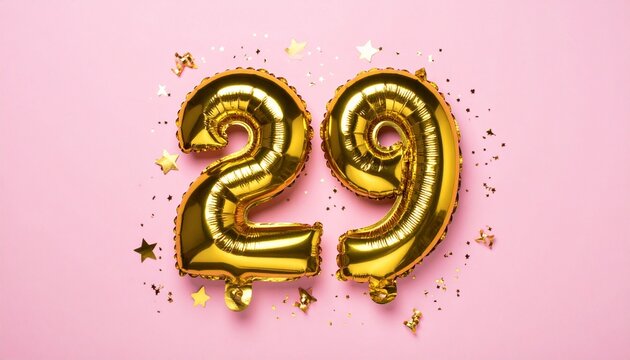 Banner with number 29 golden balloon. 29 years anniversary celebration. Bright blue background.