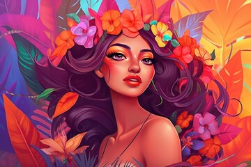 Vibrant illustration of girl with tropical rainbow flowers in her hair with room for text, banner for international day of the tropics or pride month, created with generative ai