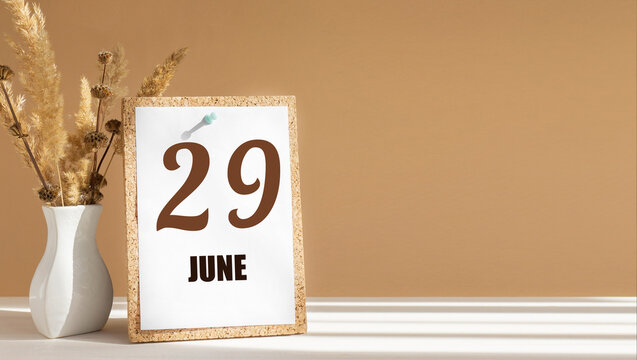 june 29. 29th day of month, calendar date.White vase with dead wood next to cork board with numbers. White-beige background with striped shadow. Concept of day of year, time planner, summer month