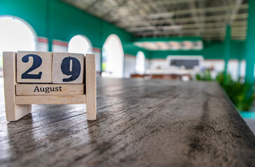 Wooden cube calendar for 29th August place on a table in a blur cafe background