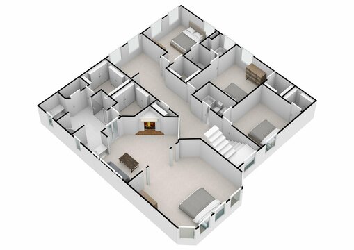 Architect's layout drawing of 4 medium size apartments with 3 bedrooms complete with furniture. 2D drawing using CAD in black and white. 4 houses sharing the same floor.