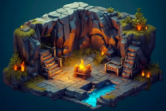 Illustration of dungeon fantasy cave. Background for mobile game in casual style, cartoon colorful AI art. Made with Generative AI