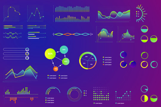 Modern neon color style data finance graphic dashboard, business finance charts for infographic. Waves graph data, 2d and volumetric diagram statistics isolated.
