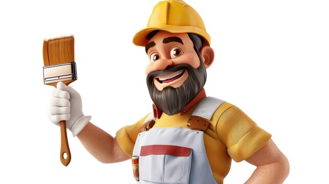 A cheerful cartoon character doubling as a handyman painter decorator is depicted with a paintbrush in hand and flashing a thumbs up gesture