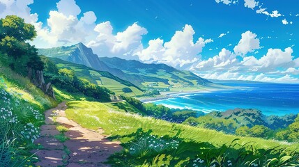 Anime Landscape with Rolling Green Hills and a Seaside Village